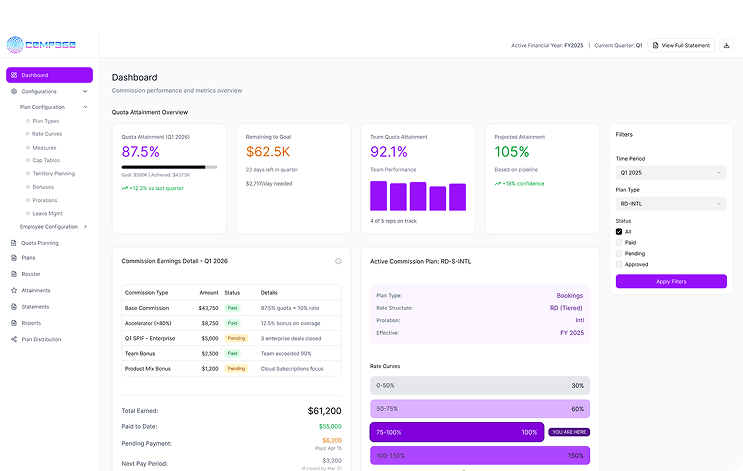 COMP360 delivers unified, AI-powered dashboards and analytics that provide RevOps insights across sales, HR, and finance. Every metric, payout, and forecast is visualized in real time.
